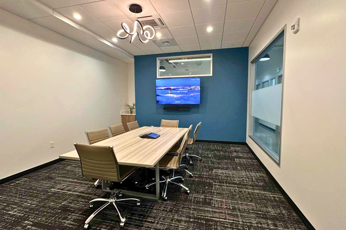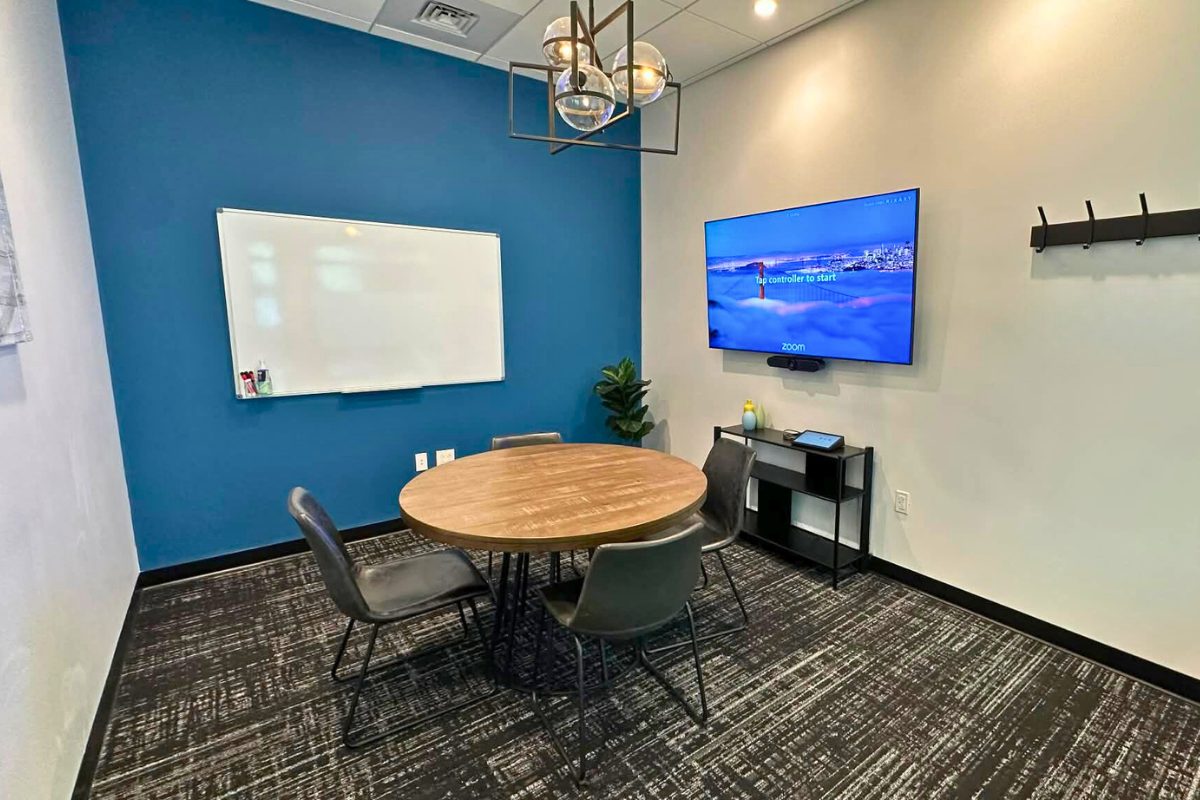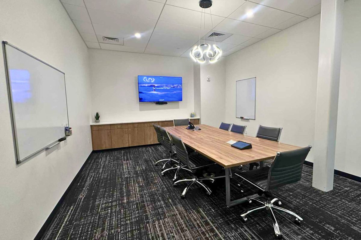 Modern space with executive seating and full Zoom Room capabilities for seamless hybrid meetings.